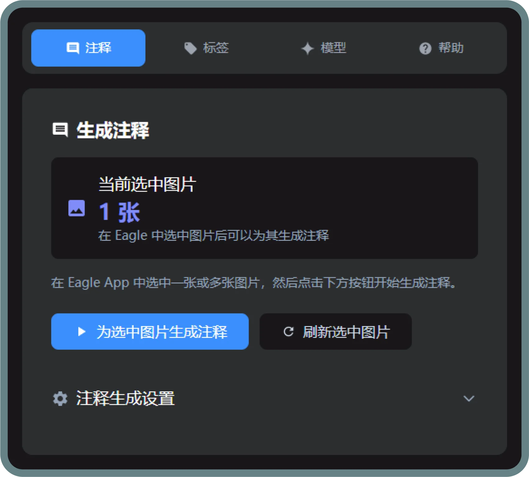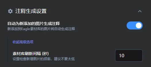 开启自动模式后,插件将监控新加入 Eagle 的图片,并自动为其生成注释、匹配标签,无需任何手动操作,实现“即入即整理”。