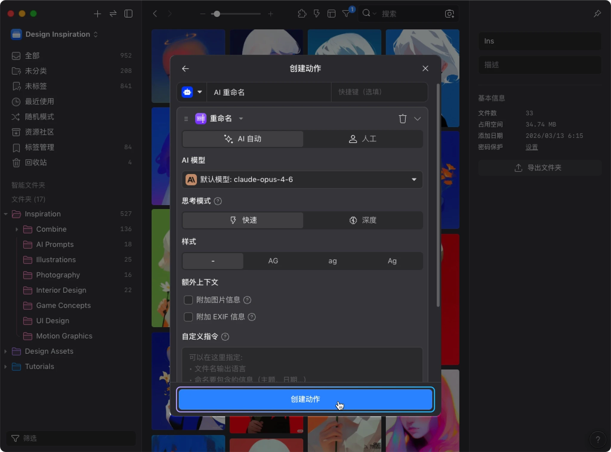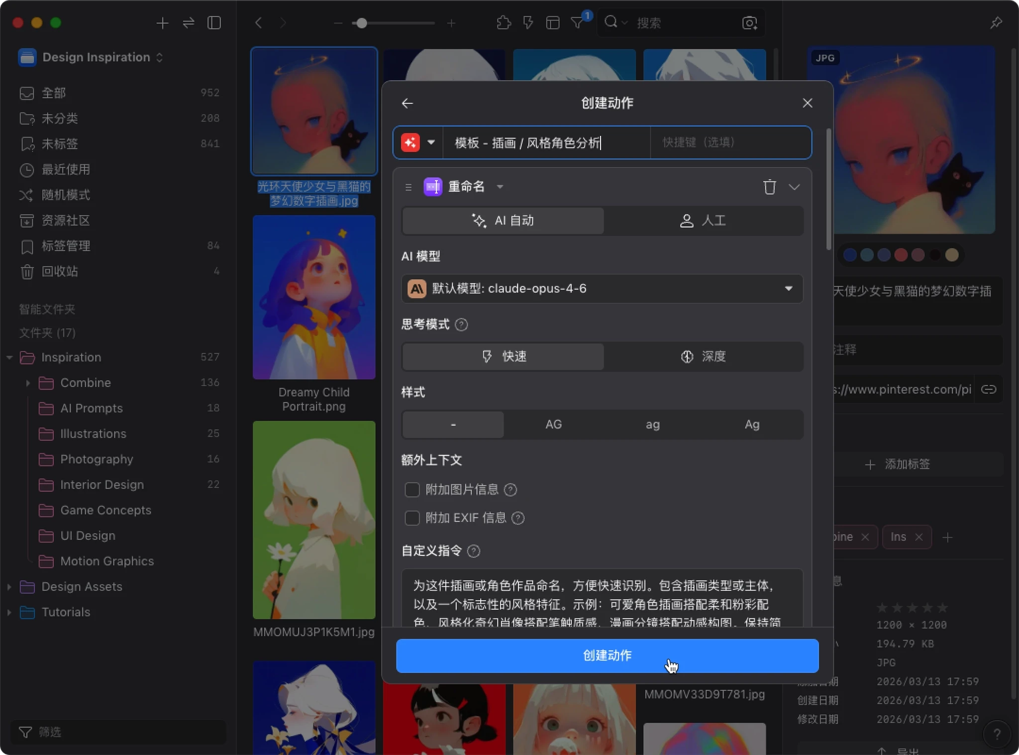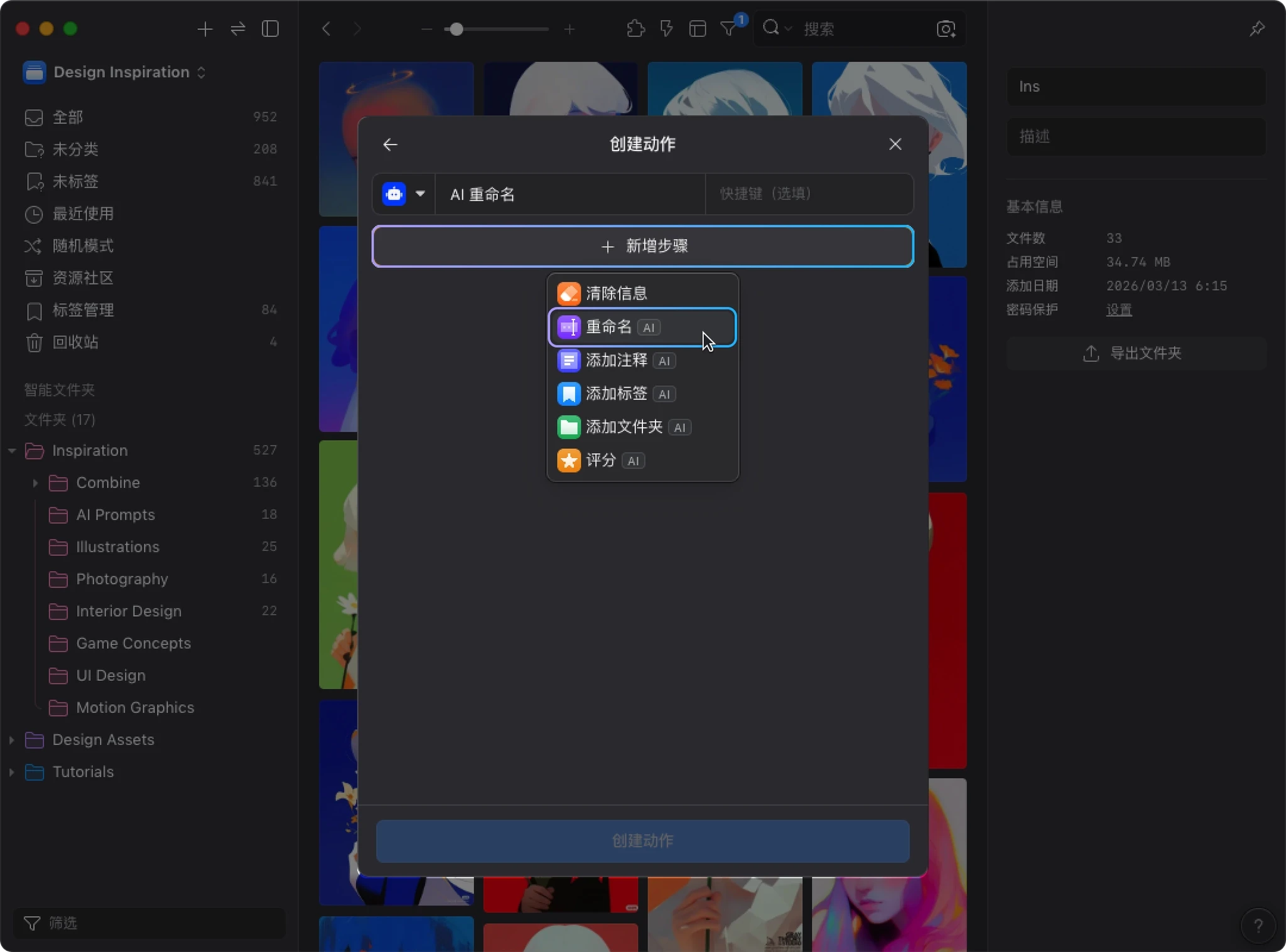 除了重命名,AI 动作 还能做描述编写、自动分类、打标签、评分等。把不同步骤组合起来,配合自定义指令,就能搭出适合自己的图片整理流程。