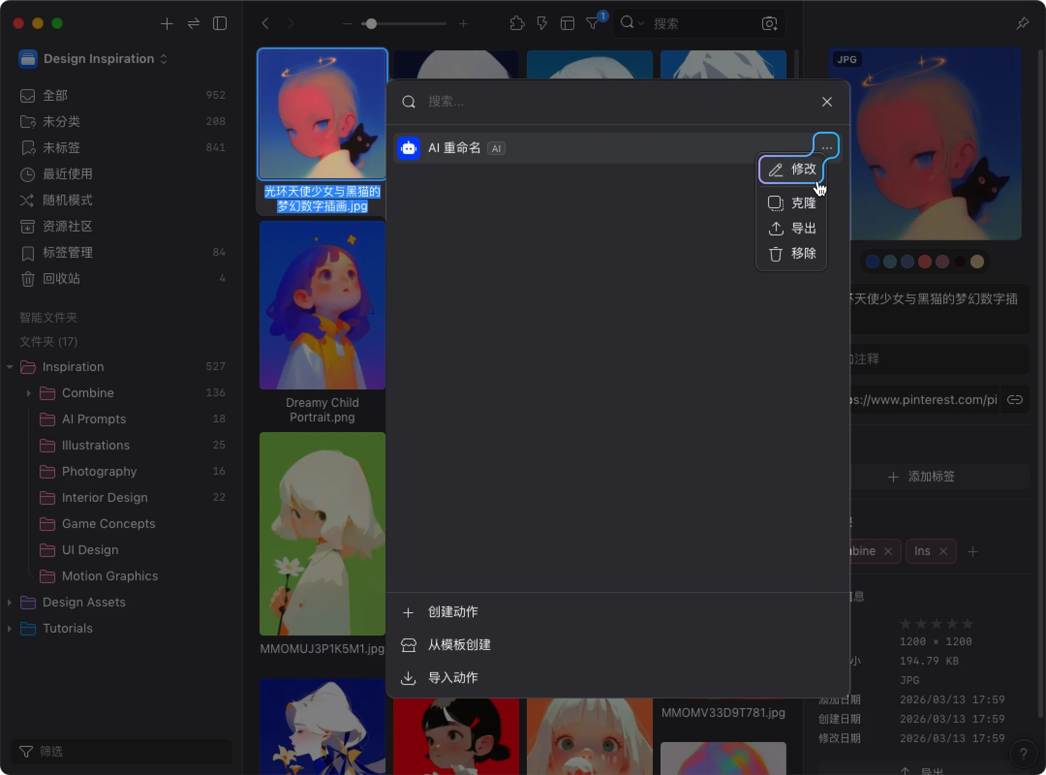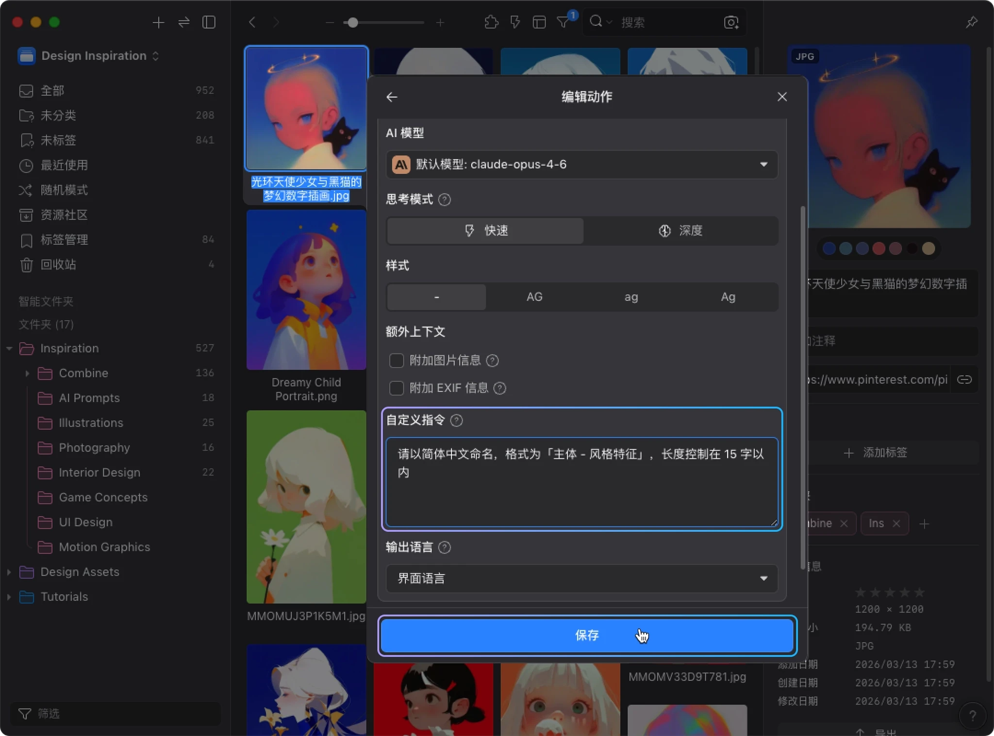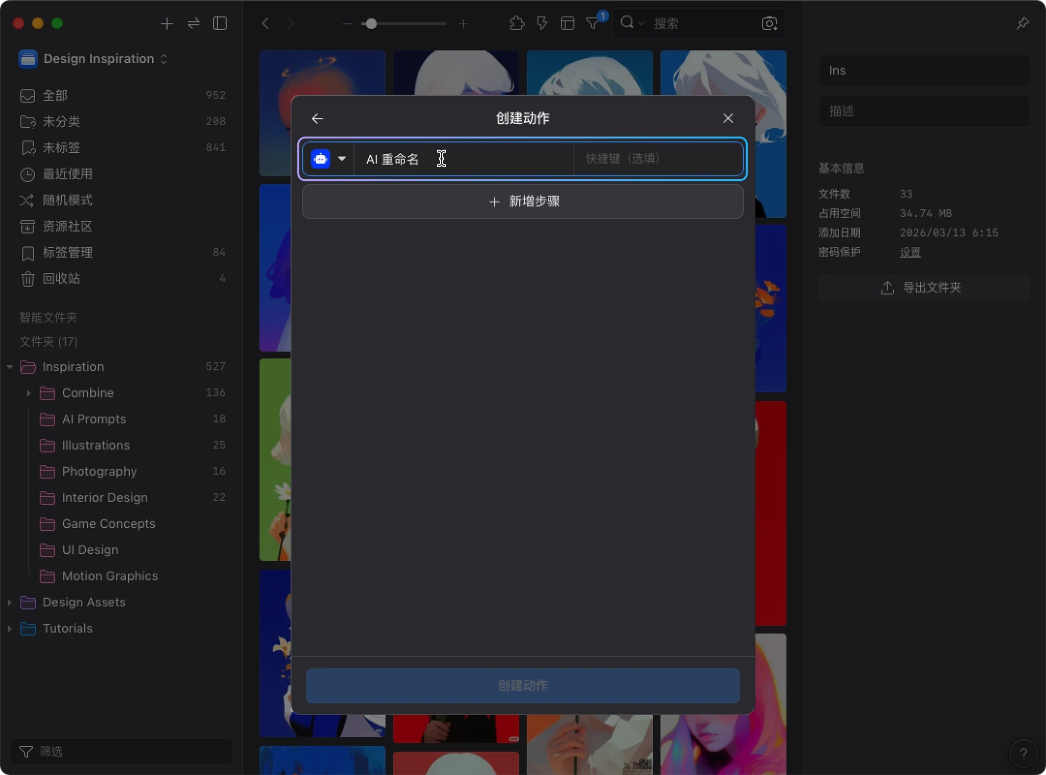 除了重命名,AI 动作 还能做描述编写、自动分类、打标签、评分等。把不同步骤组合起来,配合自定义指令,就能搭出适合自己的图片整理流程。