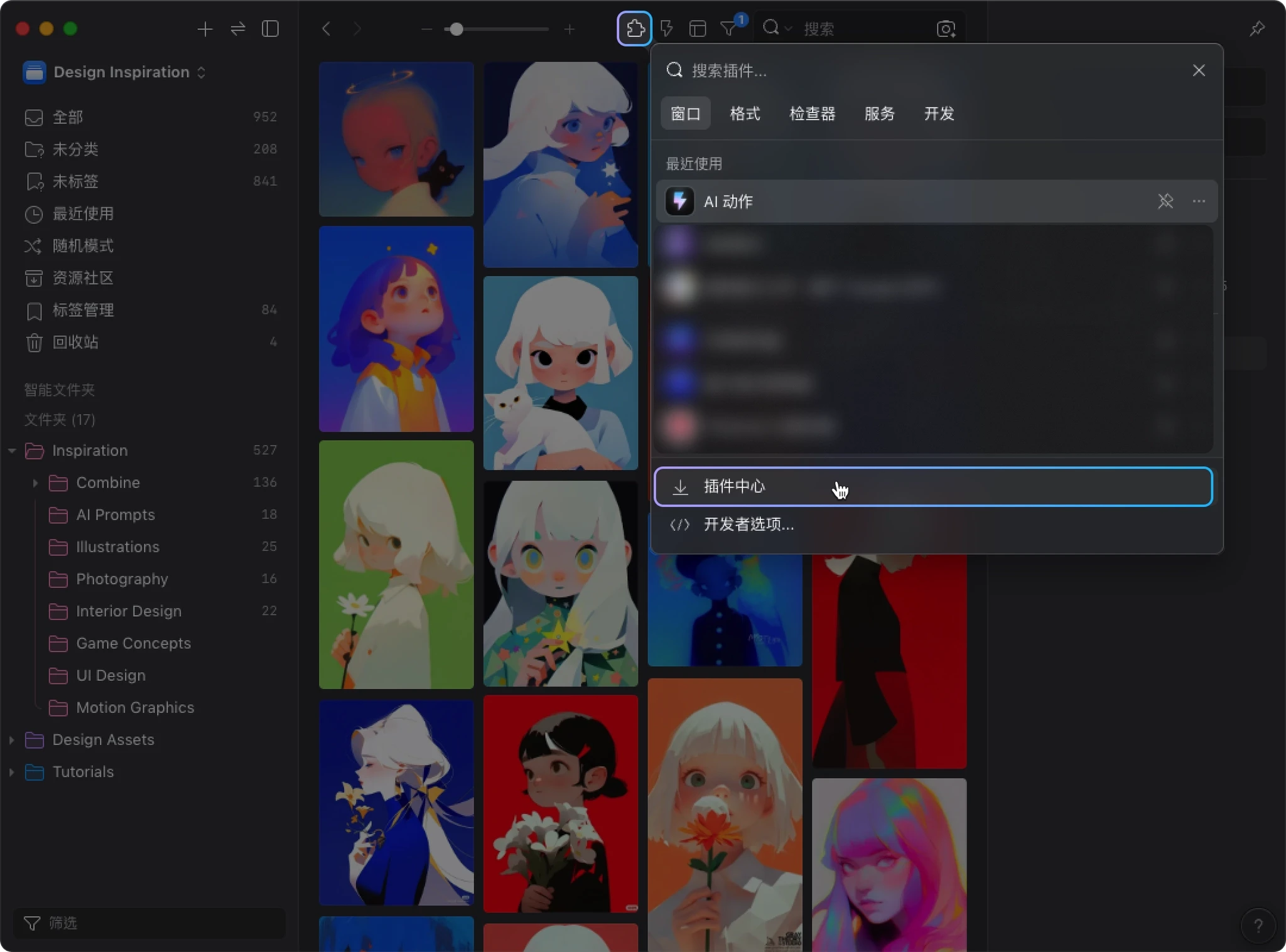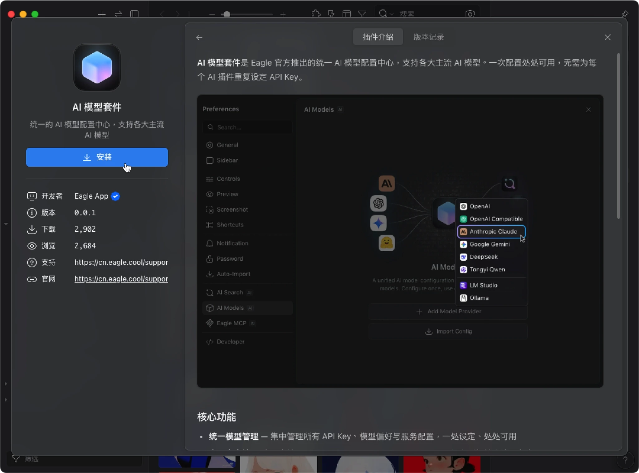 打开 Eagle → “插件” → “插件中心” → 搜索 “AI 模型套件” → 点击安装。
