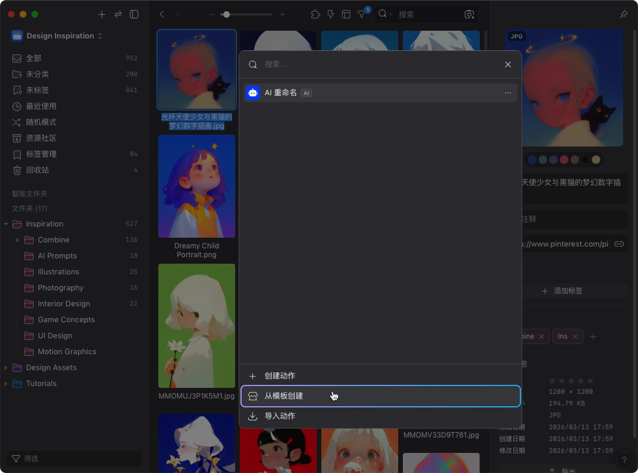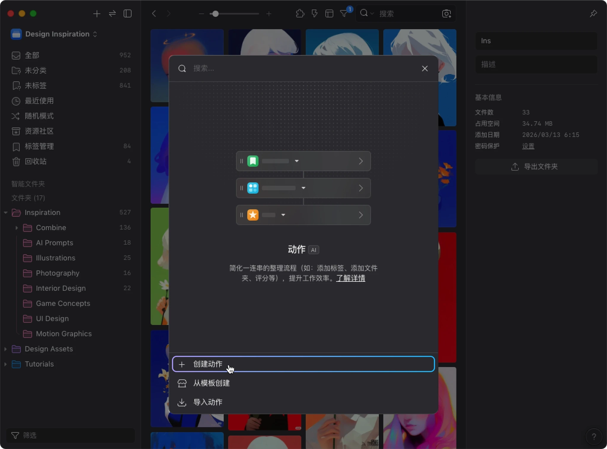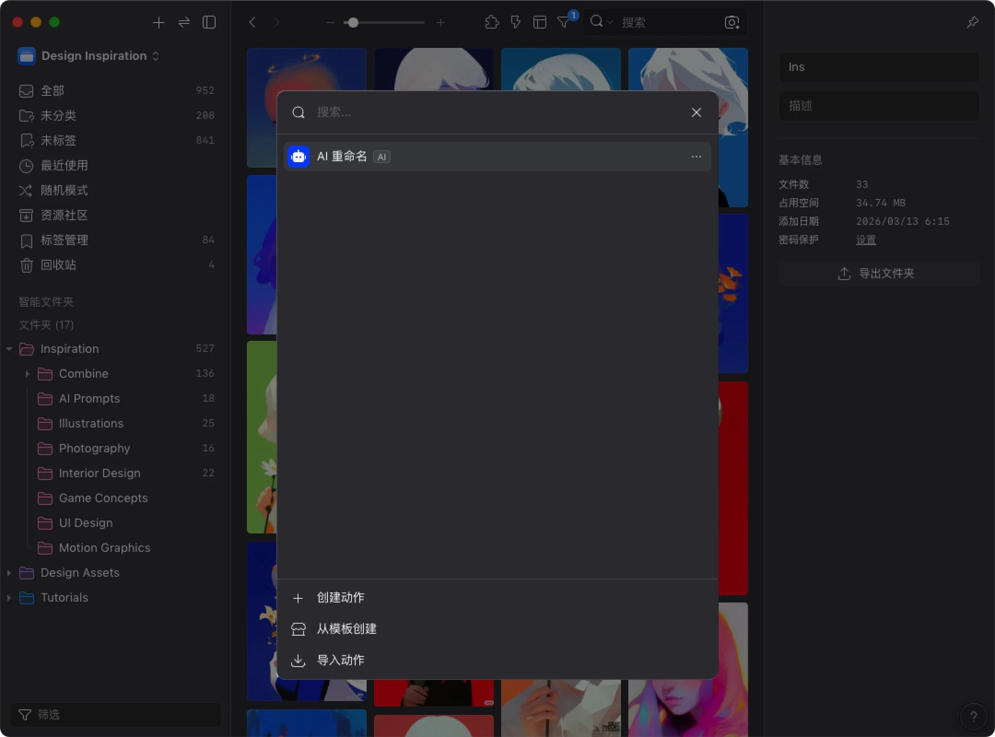 AI 搜索 会为资源库建立图片相似度索引。AI 动作 检测到这些数据后,就能参考视觉相似图片的已有整理结果来辅助判断,让分类和标签更准确、更贴近你原本的整理习惯。