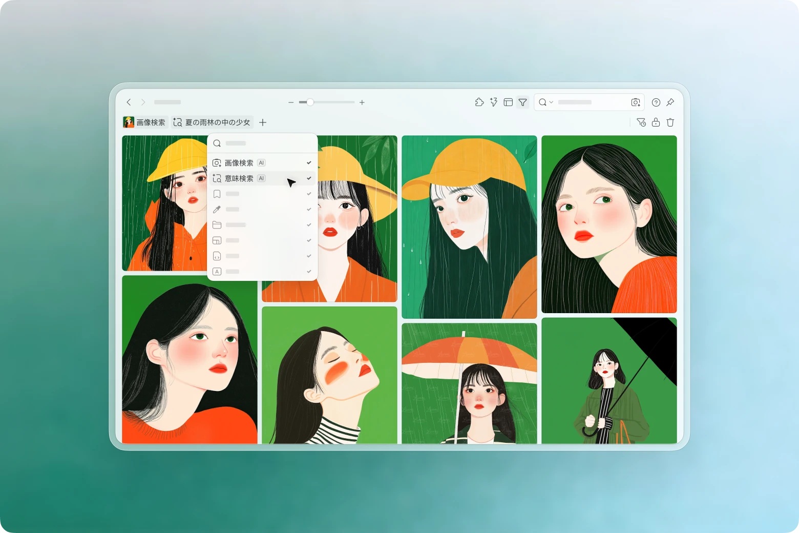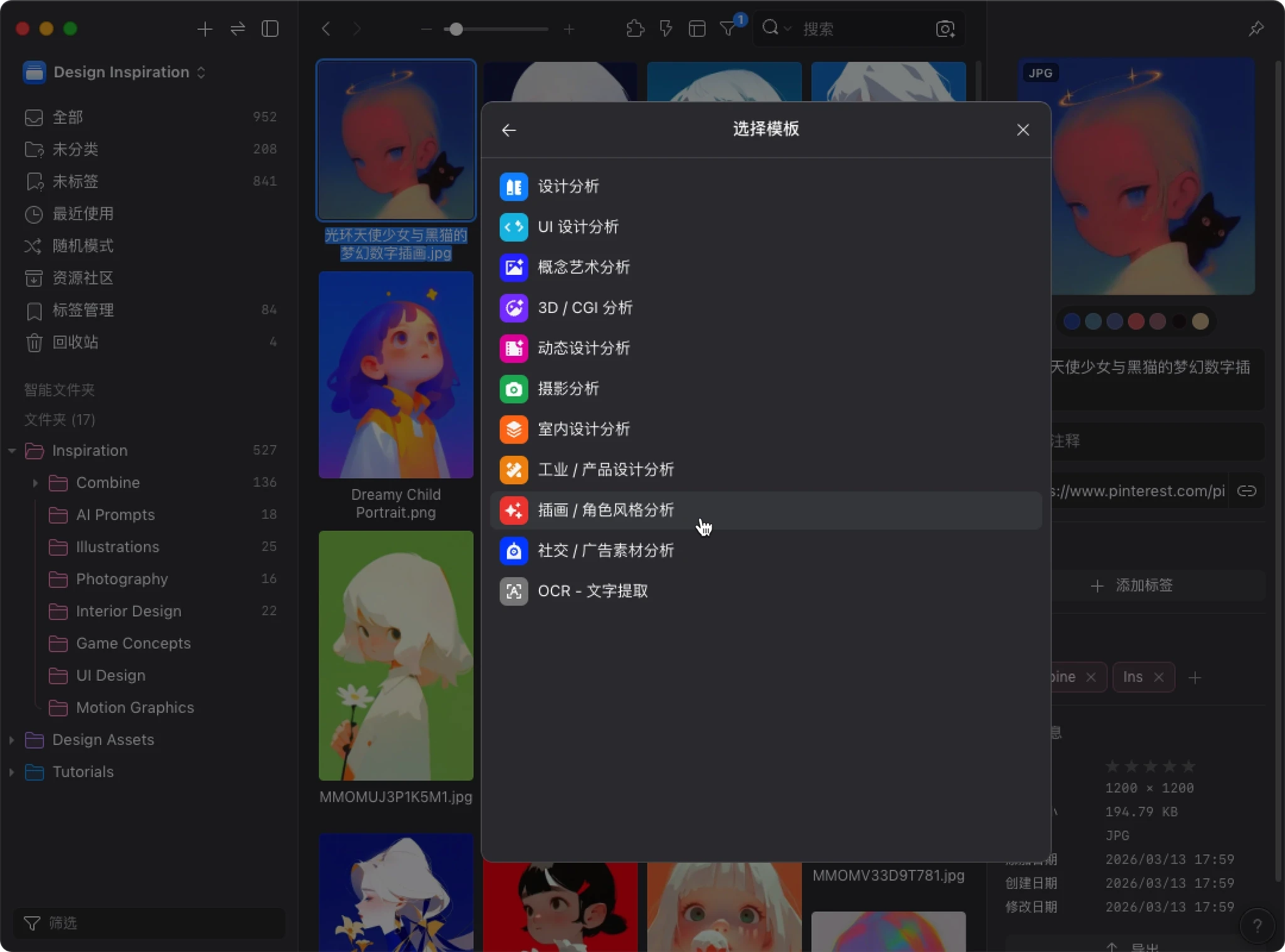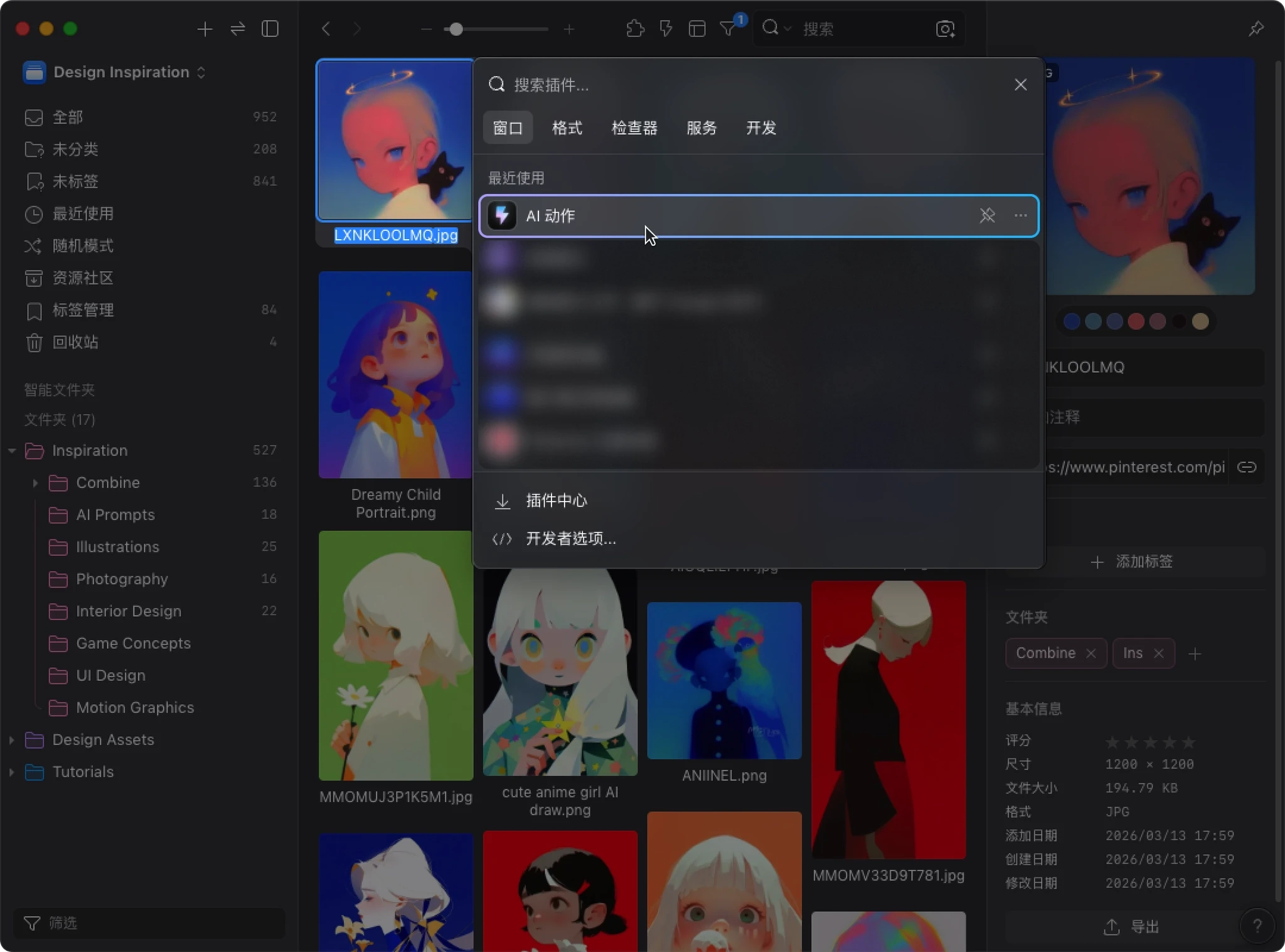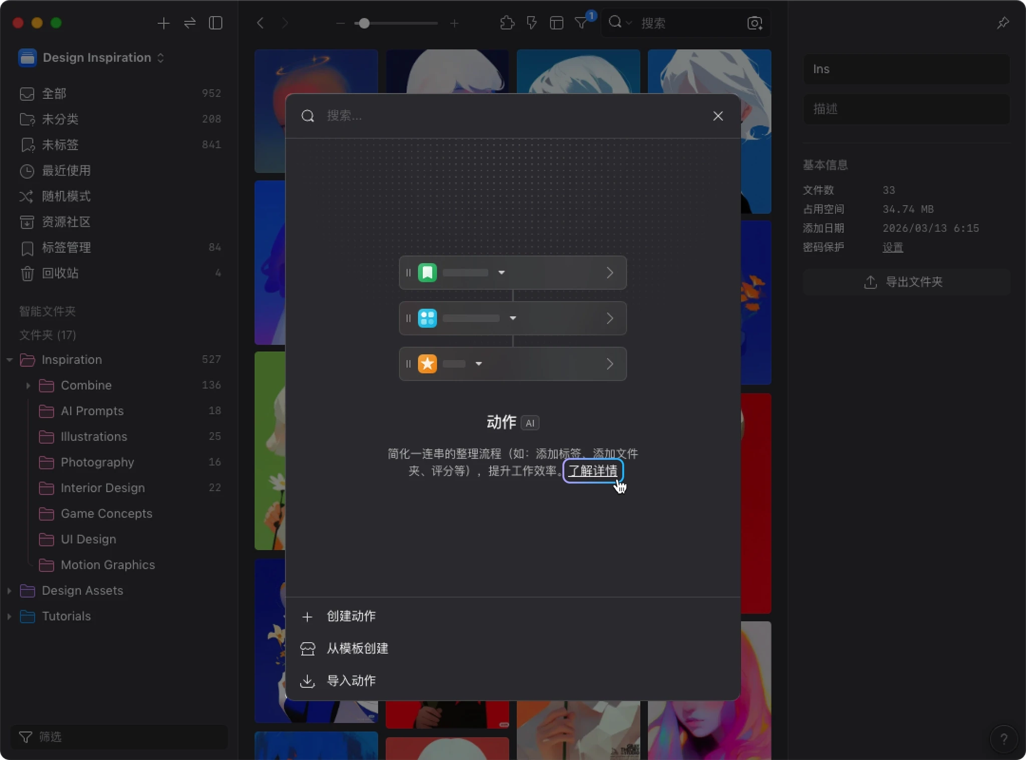 AI 搜索 会为资源库建立图片相似度索引。AI 动作 检测到这些数据后,就能参考视觉相似图片的已有整理结果来辅助判断,让分类和标签更准确、更贴近你原本的整理习惯。