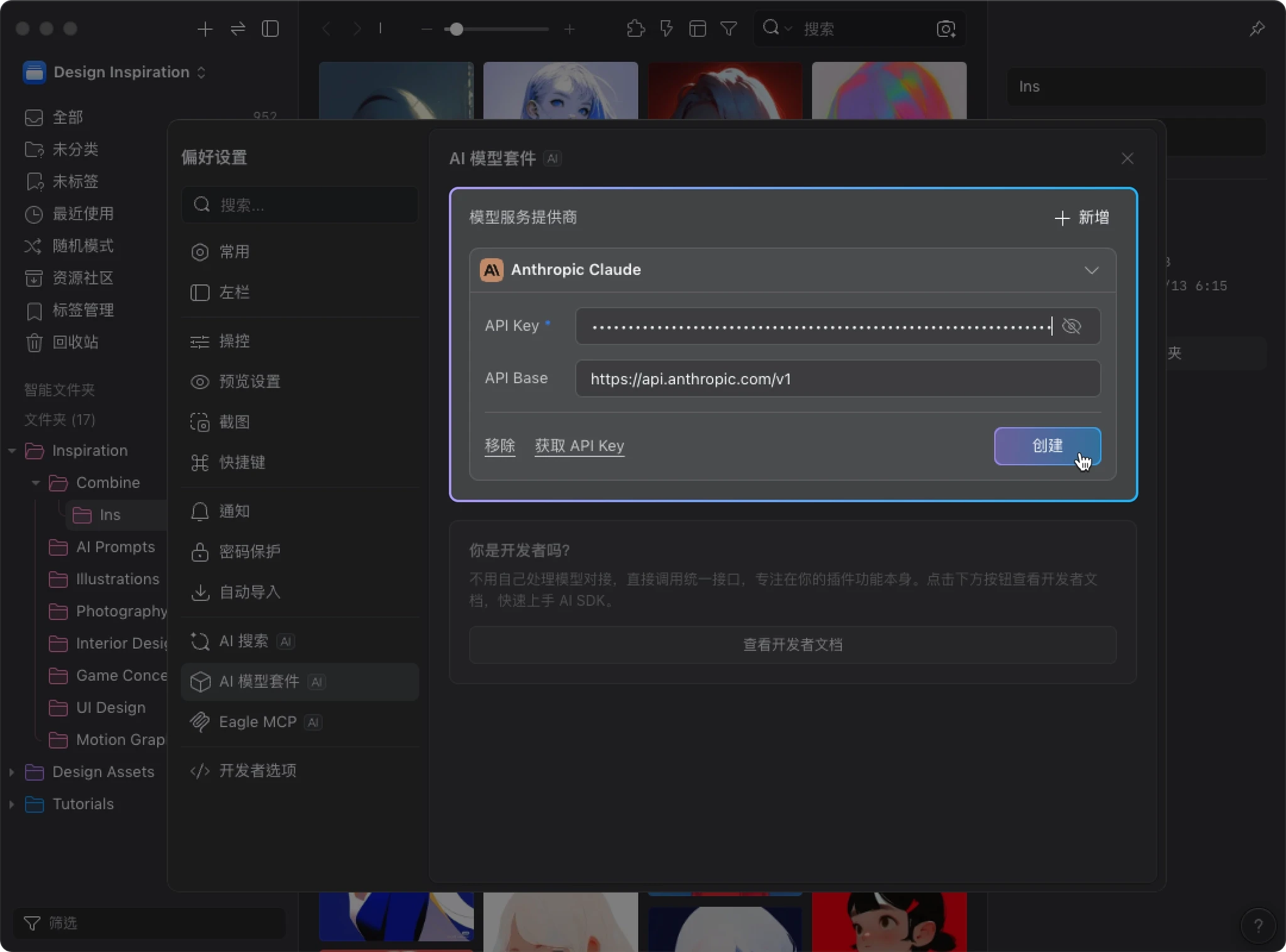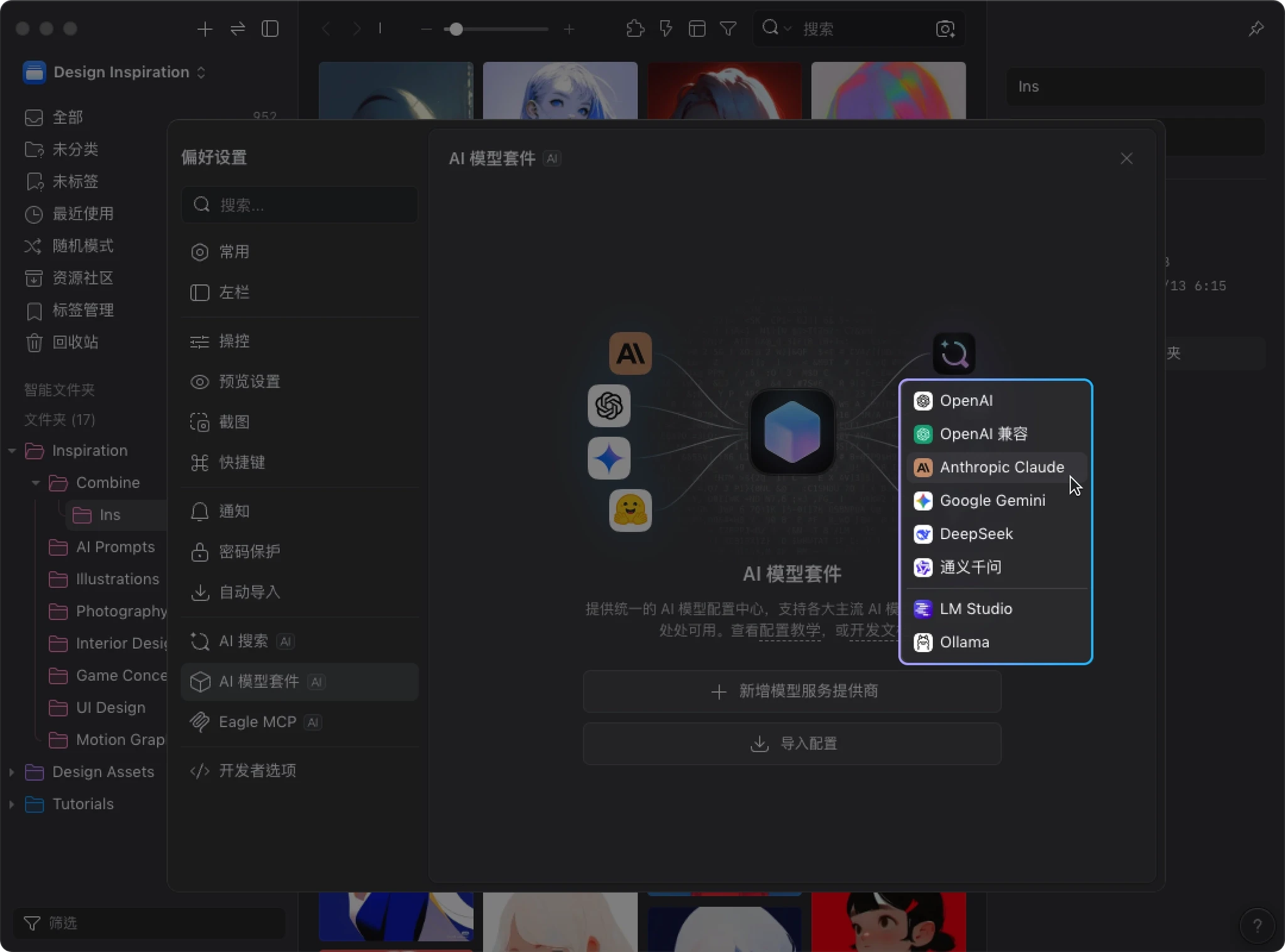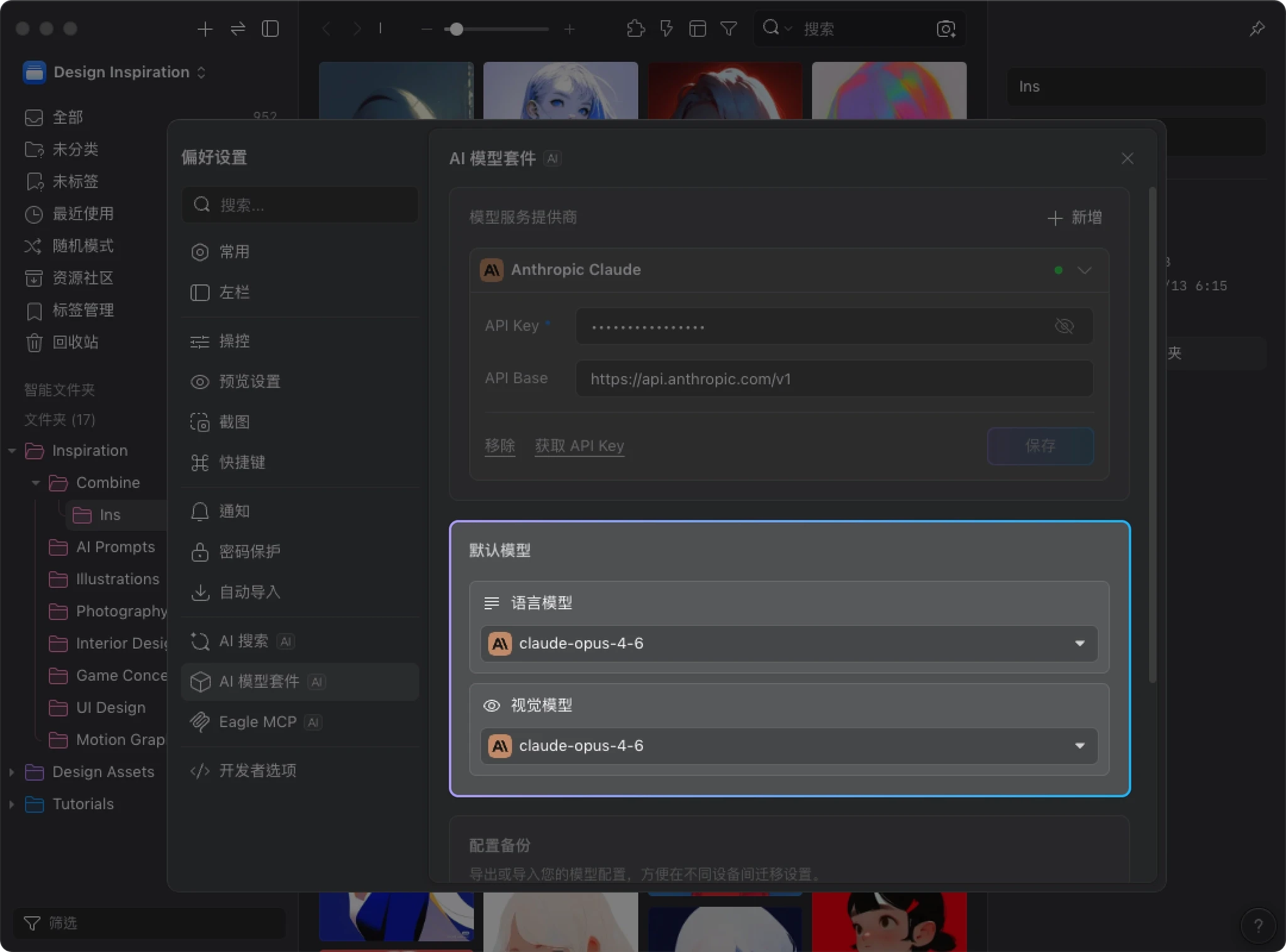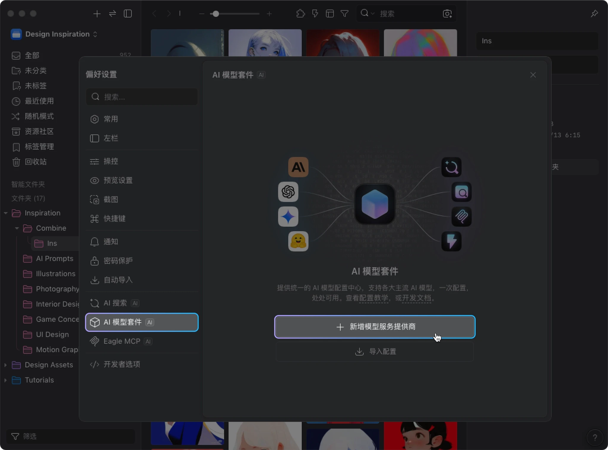 AI 动作本身负责执行工作流,但图片分析的能力来自 AI 模型。 而 AI 模型套件就是 Eagle 统一的模型配置中心,只需要安装一次,之后所有 AI 插件都可以共用这套配置。先配置好 AI 模型套件,AI 动作 才能正常运行。