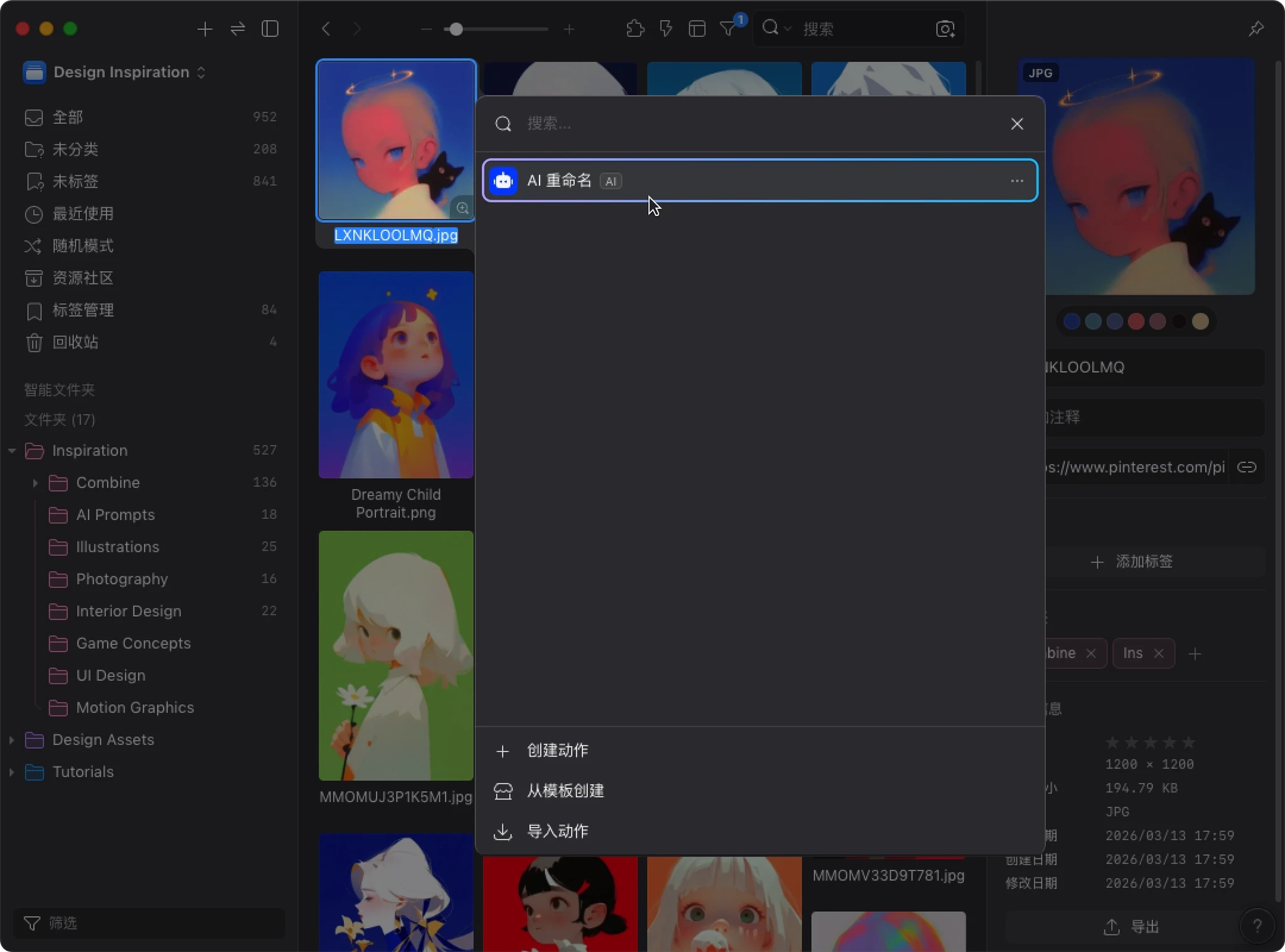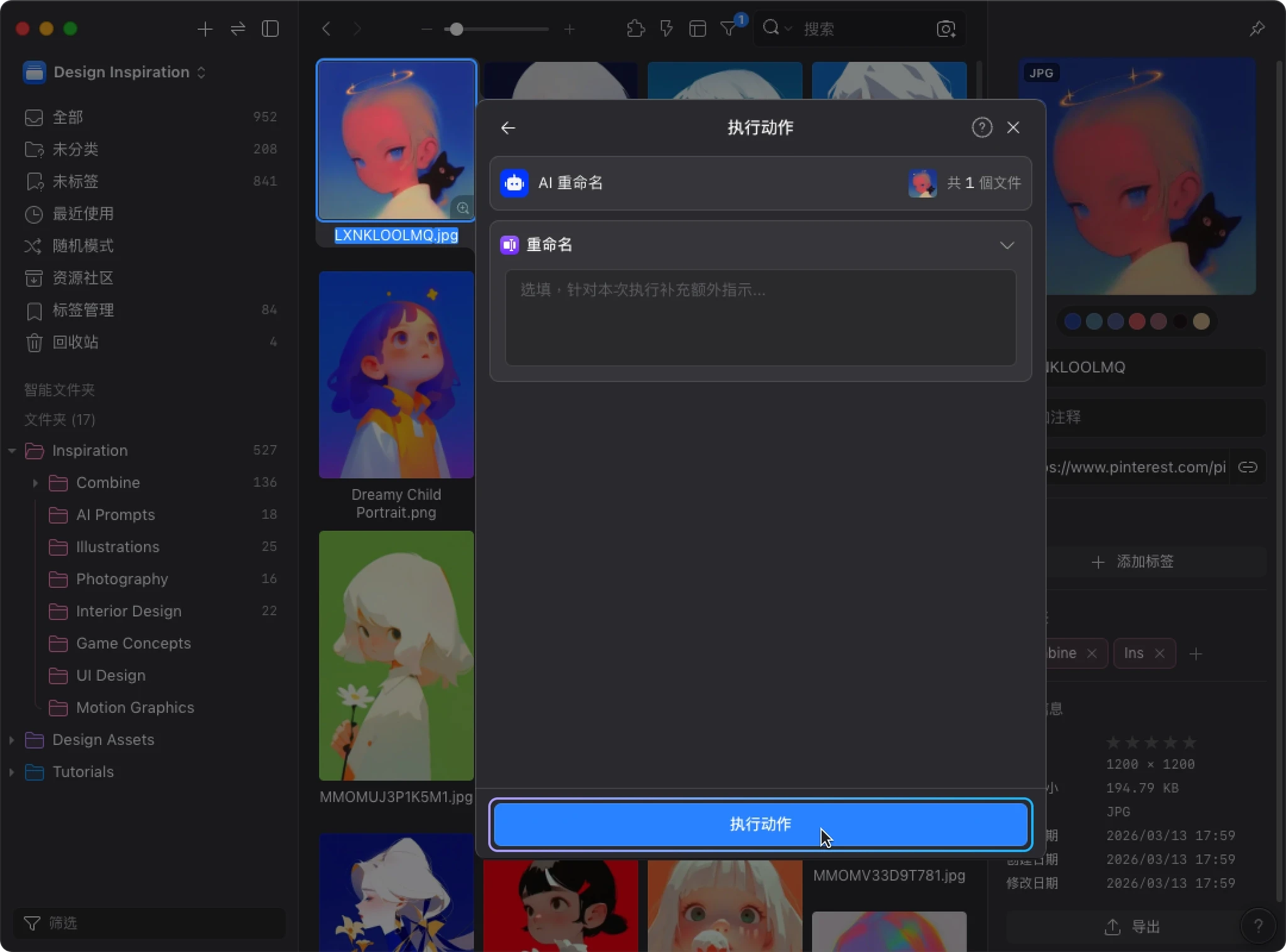 AI 动作是一款可通过 AI 自由组合的图片批量处理工作流插件。你可以让 AI 自动为图片重命名、编写描述、添加标签、分类到文件夹,甚至进行评分,将原本繁琐的整理流程浓缩成一次执行。