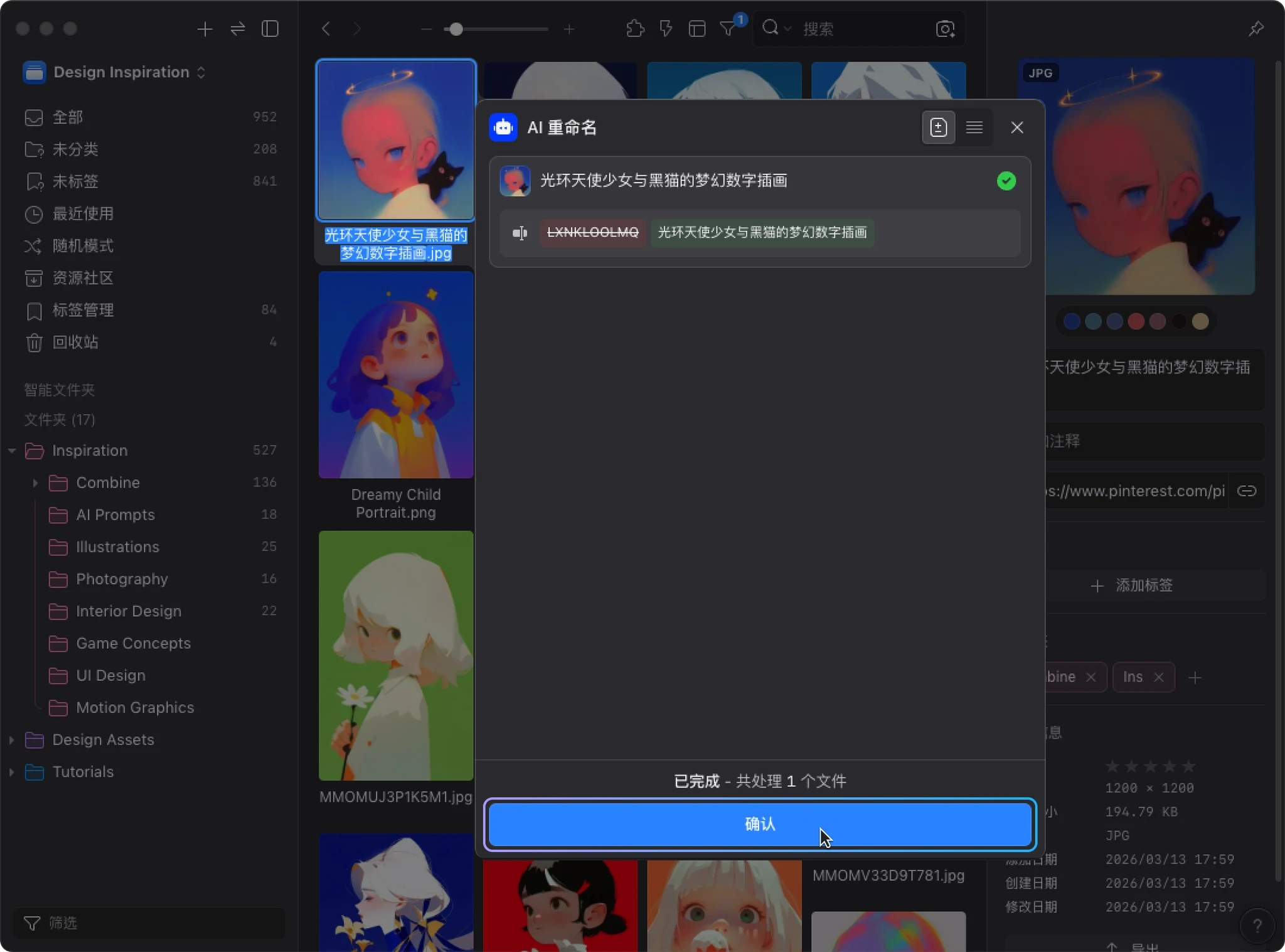 点击 “确认” 关闭窗口,回到 Eagle 文件列表后,你就会看到刚才选取的图片已经完成重命名。