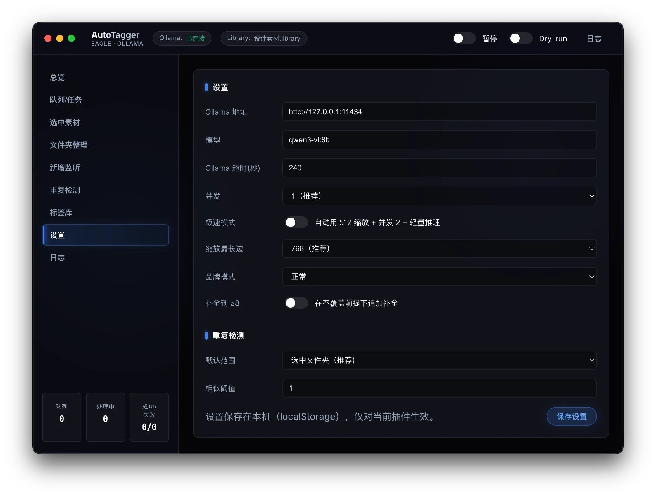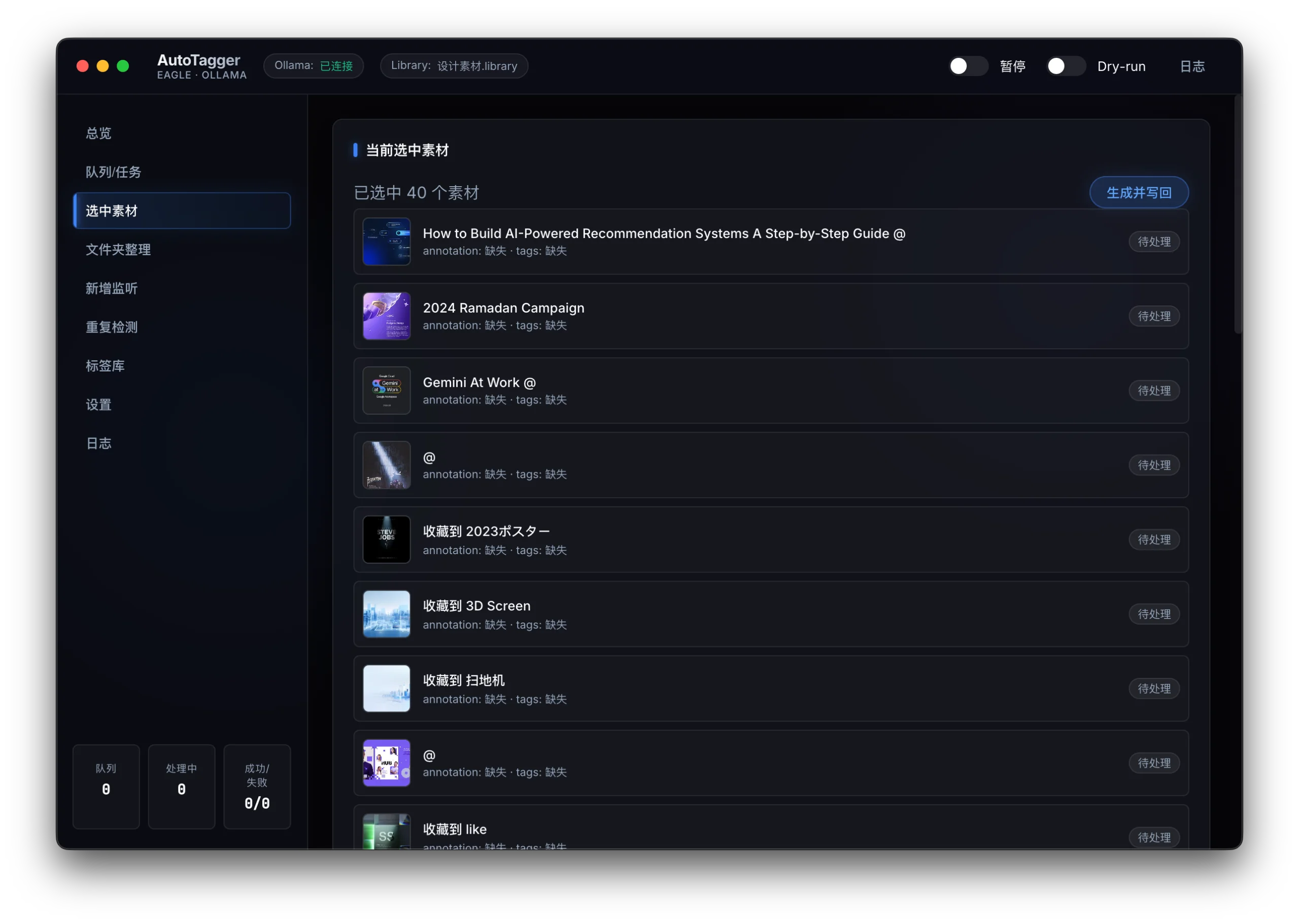 - Dry-run:只生成结果不写回 Eagle(用于验证模型/标签库/规则)