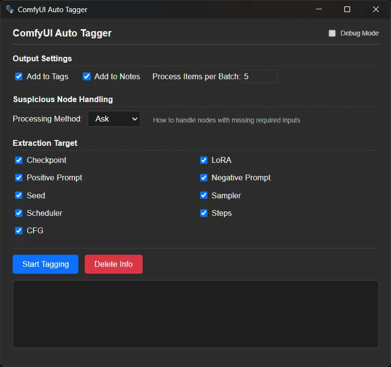 ComfyUI Auto Tagger automatically extracts generation parameters from AI-generated images and organizes them into Eagle Tags and Notes. It doesn't just read metadata; it understands it.